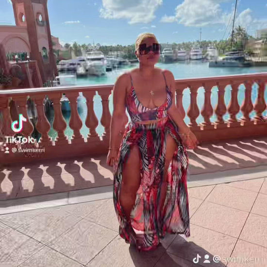 Two piece summer all over leaf batch printing top with matching high slit sexy skirt. This out has good stretch and fits comfortably.